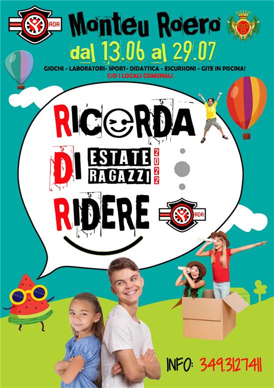 Il Comune di Monteu Roero, in collaborazione con l'Associazione RDR, dal 20 giugno al 29 luglio 2022 organizza l'ESTATE RAGAZZI 2022 per i ragazzi a partire dai 6 ai 14 anni di età.