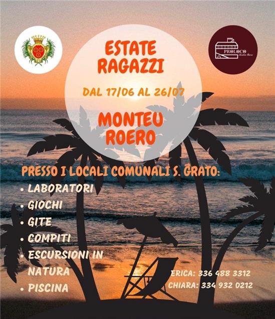 Il Comune di Monteu Roero, in collaborazione con la Proloco Monteu Roero APS, dal 17 giugno al 26 luglio 2024 organizza l'ESTATE RAGAZZI 2024 per i ragazzi a partire dai 6 ai 14 anni di età.