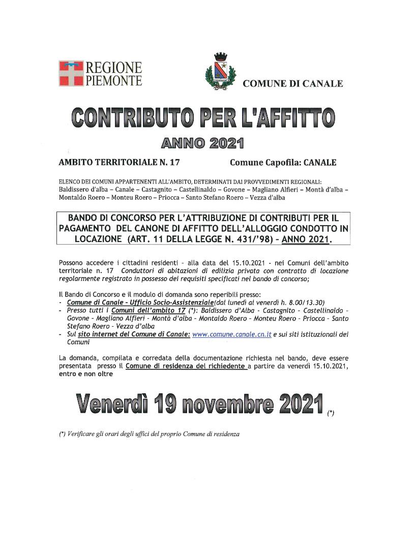 Gli interessati potranno presentare la domanda dal 15 ottobre 2021 al 19 novembre 2021. La domanda deve essere presentata al Comune di residenza (si considera la residenza alla data del 15.10.2021) utilizzando i moduli predisposti dal Comune di Canale che verranno distribuiti gratuitamente, unitamente al Bando di Concorso, presso: