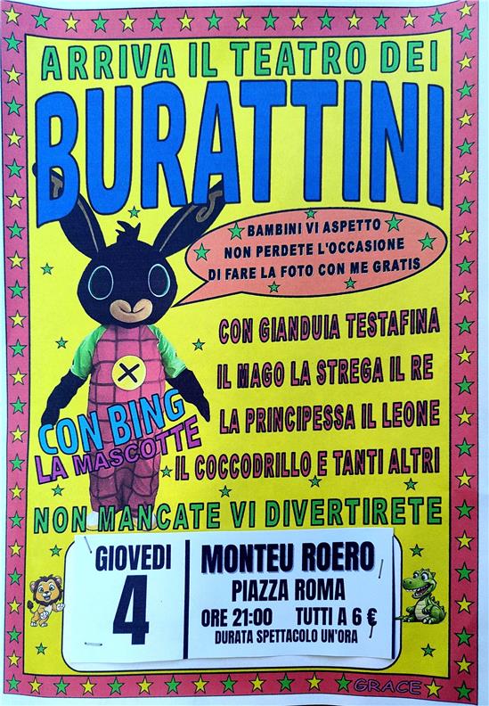 Giovedì 04 LUGLIO alle ore 21.00 in PIAZZA ROMA ci sarà uno spettacolo di intrattenimento con teatro di burattini per tutti.